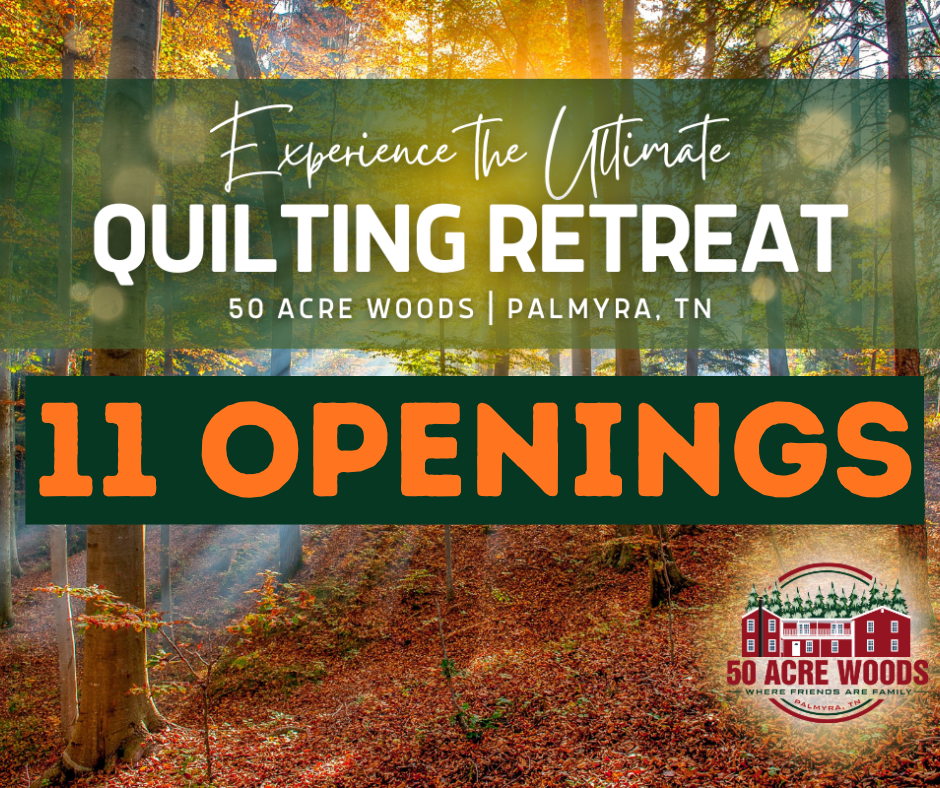 Escape to the peaceful beauty of Northern Middle Tennessee for a five-day, four-night quilting retreat like no other. Nestled in the serene woodlands of Palmyra, TN, 50 Acre Woods offers the perfect blend of comfort, creativity, and connection. Whether you’re an experienced quilter or just beginning your journey, our retreats provide dedicated time and space to focus on your craft.