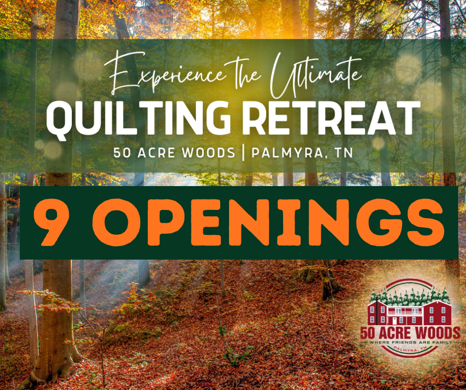 Escape to the peaceful beauty of Northern Middle Tennessee for a five-day, four-night quilting retreat like no other. Nestled in the serene woodlands of Palmyra, TN, 50 Acre Woods offers the perfect blend of comfort, creativity, and connection. Whether you’re an experienced quilter or just beginning your journey, our retreats provide dedicated time and space to focus on your craft.